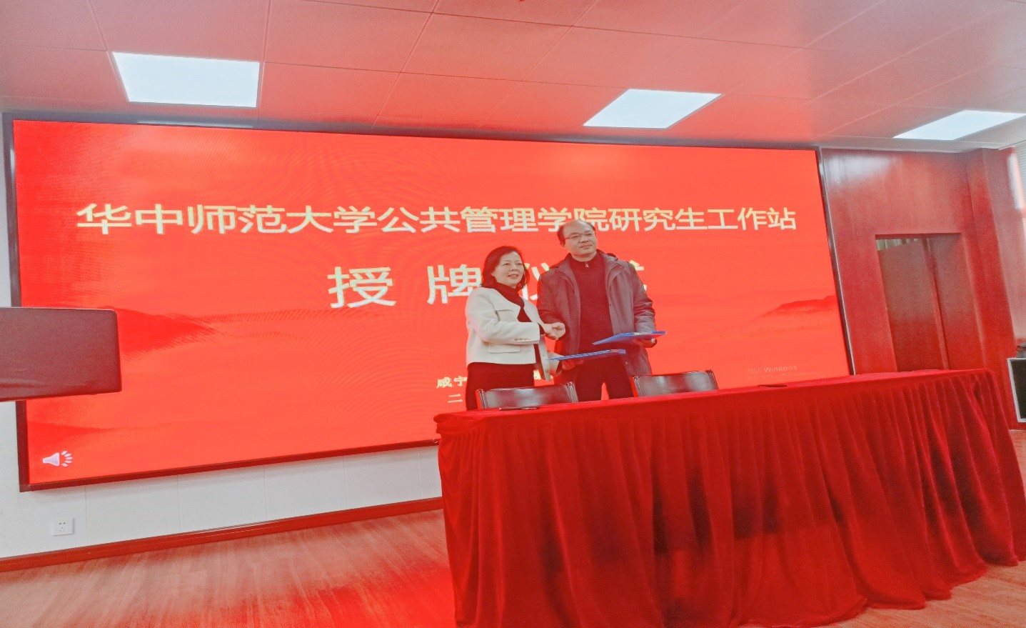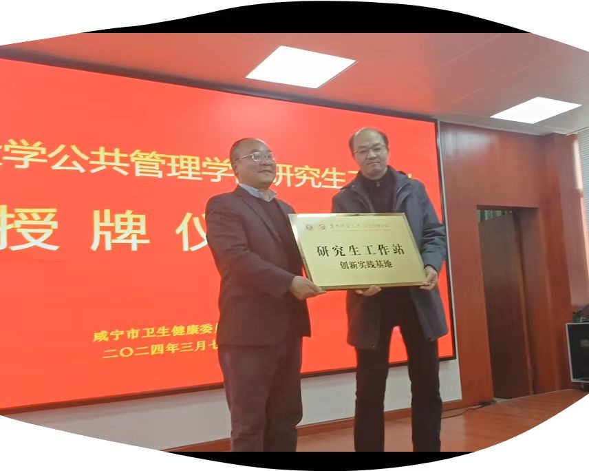 杨帆、董伟峰共同签署了《华中师范大学公共管理学院研究生工作站合作备忘录》,揭辉将“研究生工作站(创新实践基地)”的牌子授予了咸宁市卫健委,董伟峰代表卫健委接牌。