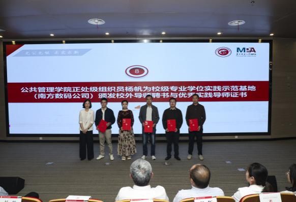 公共管理学院正处级组织员杨帆随后为校级专业学位实践示范基地(南方数码公司)颁发校外导师聘书与优秀实践导师证书,进一步夯实校企协同育人基础。
