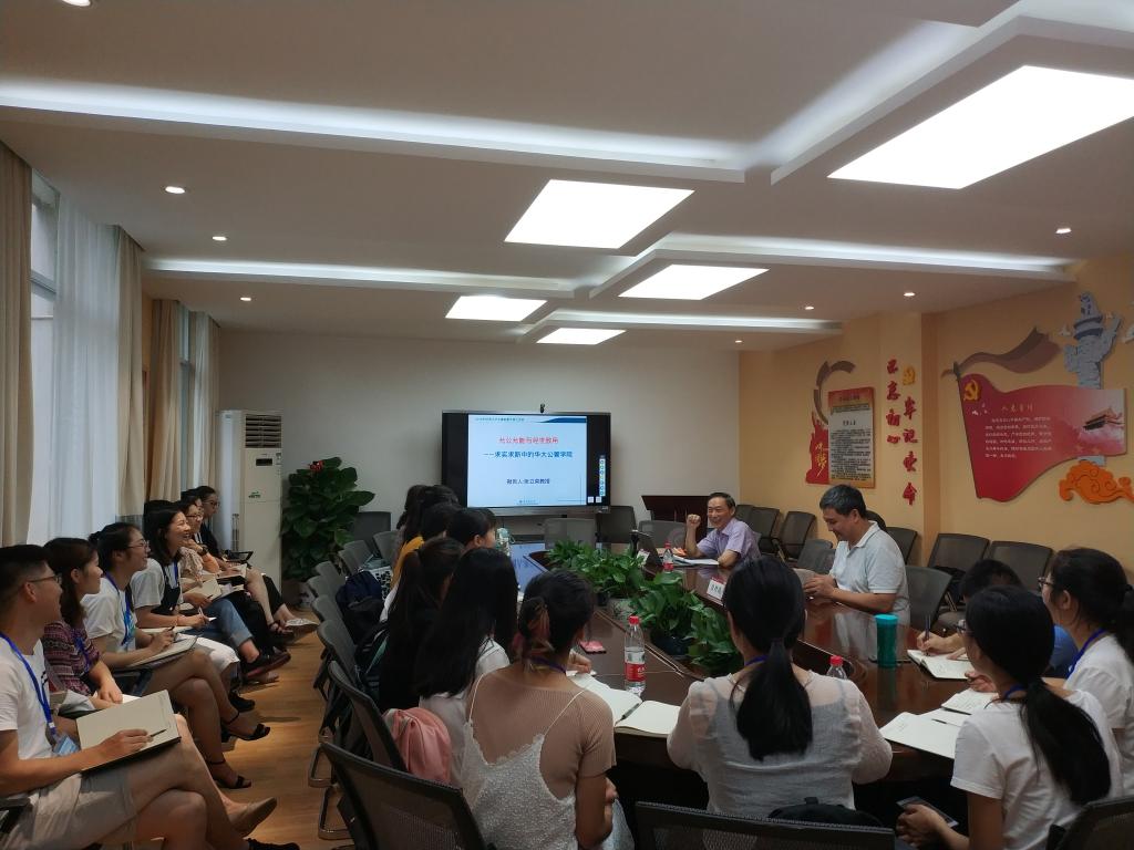 开营仪式结束后,公共管理学院张立荣教授以“允公允能与经世致用——求实求新中的华大公管学院”为题作院史讲座。张教授分别从“学院的发展始终与学科、学校的发展结伴而行和学院的院训始终是学院发挥办学功能的灵魂和指引”两个命题进行深刻阐释,细致讲解了我国管理科学发展史、我院25年的发展历程、办学思路和院训内涵等内容。
