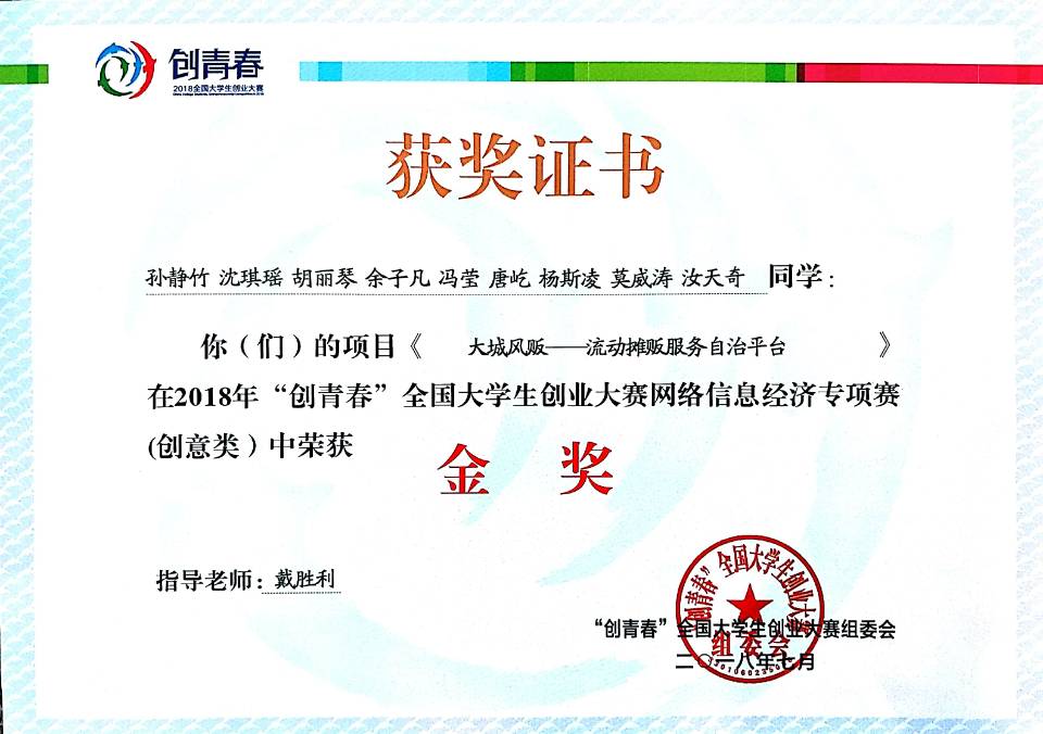 7月15日,2018年“创青春”全国大学生创业大赛MBA专项赛和网络信息经济专项赛(以下简称“创青春”专项赛)终审决赛在浙江金华圆满落幕。我院副院长兼指导老师戴胜利、党委副书记曾艳、指导老师陈刚华带队赴浙江师范大学参加了终审决赛。我院参赛项目《“大城风贩”——流动摊贩服务自治平台》(以下简称“大城风贩”)从参赛的355所院校、1708件作品中脱颖而出,荣获网络信息经济专项赛全国金奖。团中央学校部副部长、全国学联副秘书长李骥为“大城风贩”团队进行颁奖。