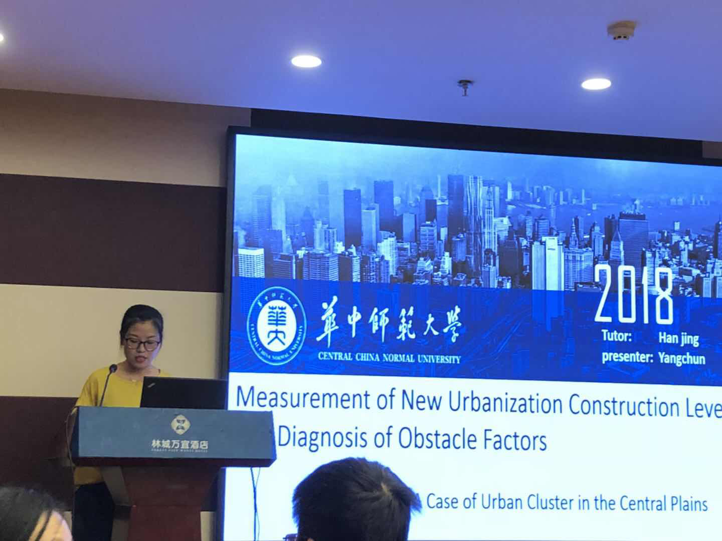 杨喜同学与卢新海教授合作的论文Temporal-spatial Evolution Patterns of Population Urbanization and Land Urbanization in China(《中国人口城镇化与土地城镇化时空格局演变》)、杨莼同学与韩璟副教授等合作的论文Measurement of New Urbanization Construction Level and Diagnosis of Obstacle Factors——A Case of Urban Cluster in the Central Plains(《新型城镇化建设水平测度与障碍因素诊断——以中原城市群9市为例》)经大会组委会审核,受邀在第一分会场进行汇报,获得与会专家与学者的赞赏与关注,两位同学也在汇报中和汇报后同多位老师和同学进行了深入交流。
