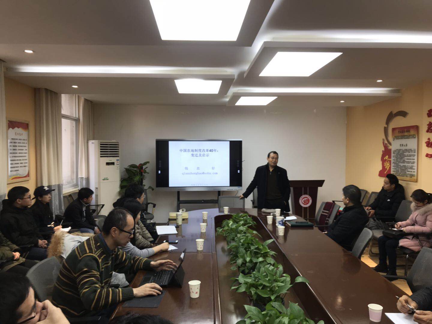 (公管在线讯 通讯员:李曼)2018年12月13日下午15:30,扬州大学中国土地政策研究中心主任、中华人民共和国教育部高等学校科学研究优秀成果奖和中国农村发展研究奖等多项奖励的获得者钱忠好教授应邀来我院做了主题为“中国农村土地产权制度改革40年:变迁与启示”的讲座。本次讲座由我院院长卢新海教授主持,来自学院各个系的教师、研究生等30多名师生参与了此次讲座。