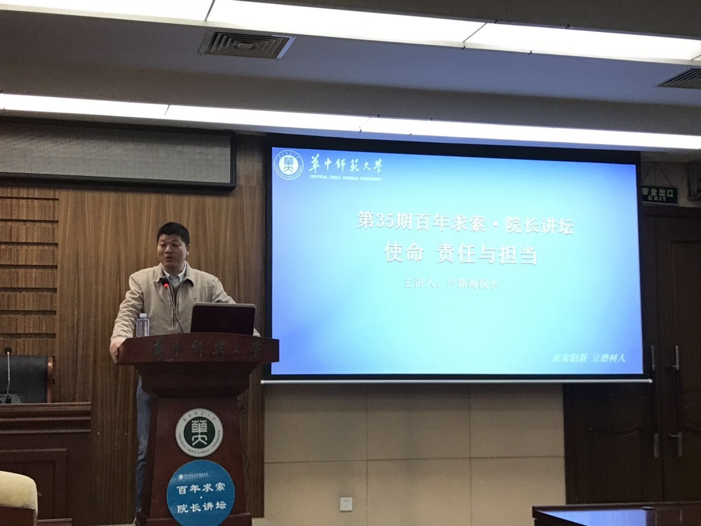 卢新海院长首先以他最近亲自回复的两封信为开场,表示这两封信件代表了研究生们的心声,认为每个学生对于规定都一定会有不同的理解,这是没有对错之分的,我们应该尊重学生的专长和兴趣。随后卢院长以博士论文的开题报告撰写为例,为我们介绍了定量研究和定性研究的区别,阐明了我们虽然倡导定量研究,但并不是强制的,提醒我们一定要注意学科边界,在一个大的研究框架下搞研究。最后,卢院长从两封信过渡到这次讲座的主题:责任、使命与担当。强调在宏观的历史背景下,每个人都应该承担起中华民族伟大复兴的历史责任。而进一步扩展敢于承担这些责任和义务的魄力就叫做担当,这其中的中心内涵就是我们应该承担的责任。