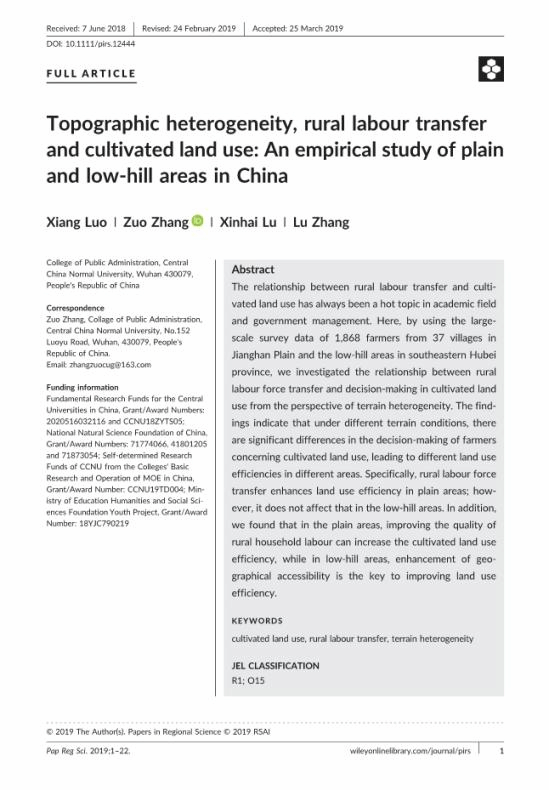 公管在线讯(通讯员:敖心荷)近日,我院罗翔、张祚、卢新海、张路等学者所作论文“Topographic heterogeneity, rural labour transfer and cultivated land use: An empirical study of plain and low‐hill areas in China”被SSCI期刊《Papers in Regional Science》录用。
