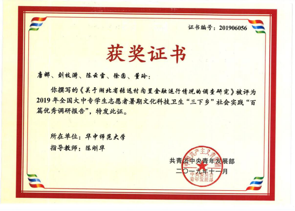2019年暑期我院行至实践队在陈刚华老师的指导下,深入湖北省鄂州市涂家垴镇张远村调研内置金融合作社运行情况。队员们通过走访张远村的简臣湾、韦进士湾、刘道师湾和吴席湾等近十个自然湾的农户,了解了张远村内置金融合作社的运行状况、成效与困境,以及张远村本村村民对合作社的看法与评价,提出了建立在传统农业社会血缘、亲缘、地缘关系的 “熟人社会”基础上的张远村内置金融合作社,利用农村资源资产的产权交易,达到解决小额、临时的生产生活资金需求,能让失血的农村金融真正实现产权、金钱的流转。张远村内置金融村社模式为推进新时代中国乡村振兴战略和精准扶贫工作提供重要个案范例与经验启示。