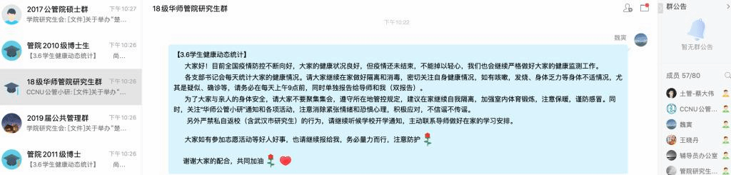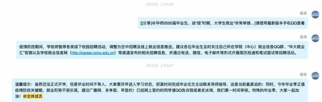 疫情还未结束,毕业生的就业是魏寅老师目前最为牵挂的问题,也是他参与战疫需要面对的硬骨头。他认真做好国家就业政策和各类就业信息的宣传员,在毕业年级群发布就业信息和温馨提示,倡议坚定信心,主动出击、积极行动,尽早签约。他说:“我正计划在线召开毕业生就业工作会,做好一生一策就业帮扶,并请毕业院友支持就业工作。多管齐下,相信一定能把这个难题解决好。”就像他日记中写到的:“撼山易、撼中国人难!疫情的寒冬即将过去,希望的春天就要归来。每个人都在坚守,我们的胜利也越来越近。”