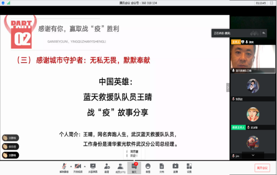 蓝天救援队队员,清华紫光软件武汉分公司总经理王晴应邀分享亲身经历的抗疫故事。王晴从执行汉口火车站全面消杀任务的台前幕后、个人战疫工作历程、3月8日“感恩行动”等内容展开讲述,娓娓道来,引人入胜,感人至深,在平凡的工作中彰显出大爱和伟大。他倡导同学们加入蓝天救援队等公益组织,在奉献中实现人生价值。