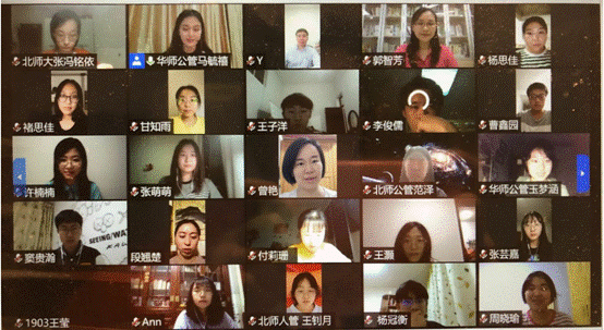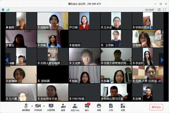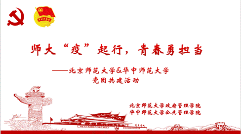 2020年5月15日19:00,北京师范大学政府管理学院联合华中师范大学公共管理学院开展以“师大‘疫’起行,青春勇担当”为主题的党团日活动。出席本次活动的嘉宾有北京师范大学政府管理学院党委书记于海波老师,华中师范大学公共管理学院党委书记揭辉老师,北京师范大学政府管理学院党委副书记郭智芳老师,华中师范大学公共管理学院党委副书记曾艳老师,北京师范大学团委副书记许楠楠老师,华中师范大学团委副书记崔宏博老师,北京师范大学政府管理学院团委书记褚思佳老师,华中师范大学公共管理学院团委书记马毓禧老师。参会的党、团支部有北京师范大学政府管理学院学生第一党支部,北京师范大学政府管理学院学生第四党支部,华中师范大学公共管理学院研究生1801党支部,北京师范大学 2018 级公共事业管理本科生团支部,北京师范大学 2019 级人力资源管理本科生团支部,华中师范大学公共管理学院本科 1803 团支部以及华中师范大学公共管理学院本科 1903 团支部。本次活动由华中师范大学公共管理学院团委书记马毓禧老师主持。