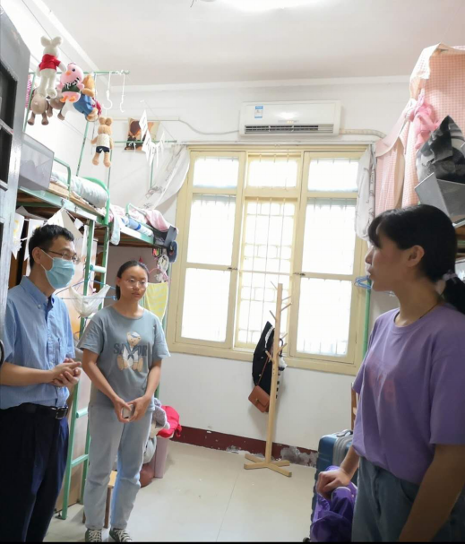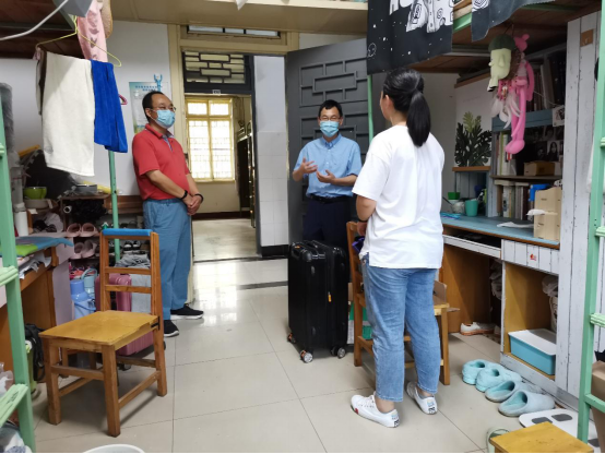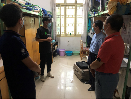 (公管在线讯 廖伟)8月26日下午,副校长李鸿飞到西区六栋和一栋宿舍看望慰问我院2017级返校学生。学工部副部长李刁、后勤保障部副部长熊妮丽、校办陈晓宇、学院党委书记揭辉、学院副书记曾艳、团委书记佐一男等陪同看望学生。