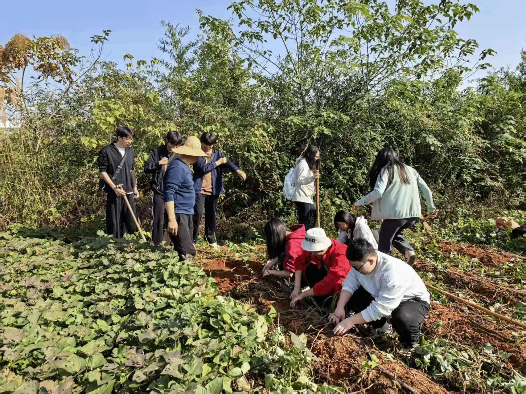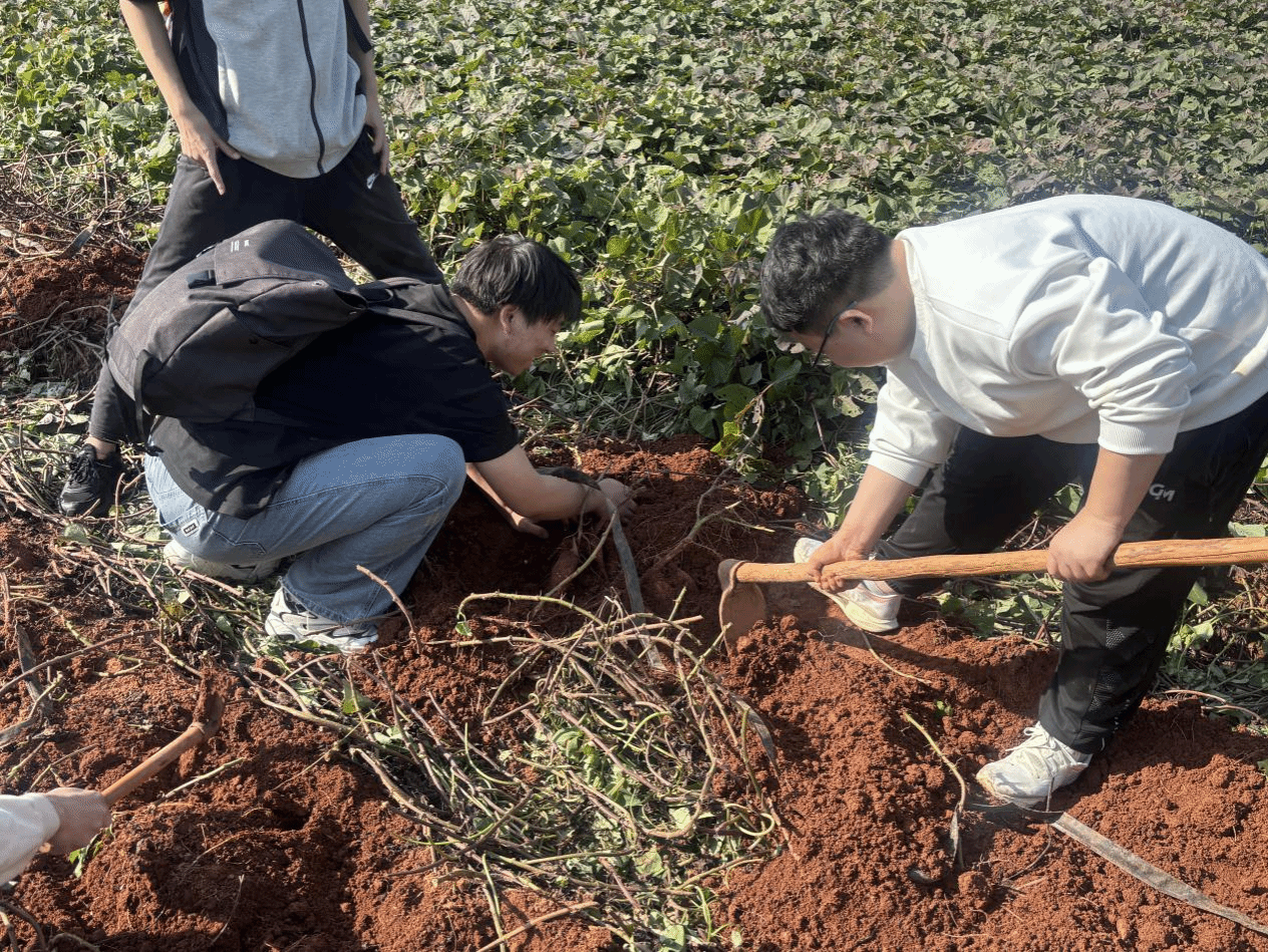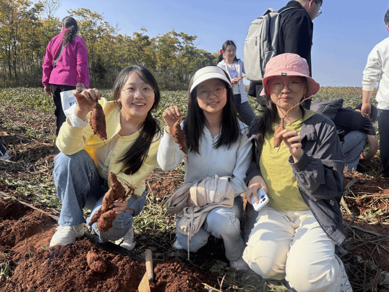 下午,在湖北薯旺现代农业产业综合中心的红薯地里,同学们蹲在田垄间,手持农具体验红薯采收,感受劳动的乐趣。作为江夏区现代农业示范点,胜丰村5000亩红薯地既是产业园区,也是城乡互动“实践窗口”。这次采收体验,让同学们直观感受“从田间到餐桌”的产业链。