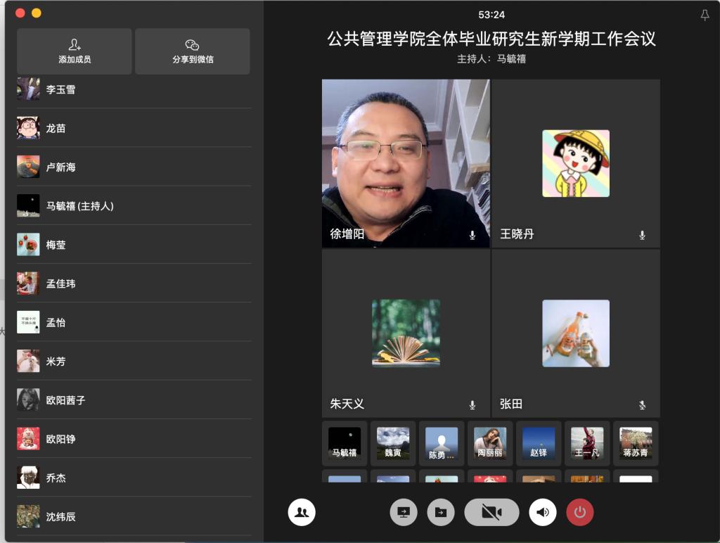 至此,公共管理学院2020届毕业研究生线上工作会议圆满结束。学院高度重视今年毕业生就业工作,动员全体教职工和校友关心支持毕业生就业,相信在全体师生共同努力下,全员参与,齐心协力,一定能打赢2020届毕业生就业攻坚战。